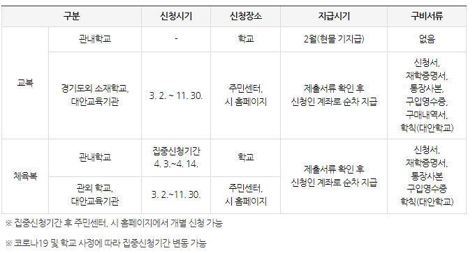 ※ 단, 고양시 및 다른 시ㆍ도 또는 기관 등에서 교복을 지원받지 않은 경우에 한 함 (중복 수혜 불가)