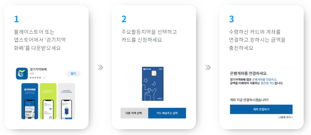 충전방법은 간단합니다. 경기지역화폐 어플을 설치하신 후 주요활동지역을 선택해주세요. 그리고 배송받을 주소와 카드를 신청하면 됩니다. 여기에서 자신의 거주지 주소가 아니라 직장이라던지 다른 곳으로도 배송받을 수 있는점도 참고해주세요.