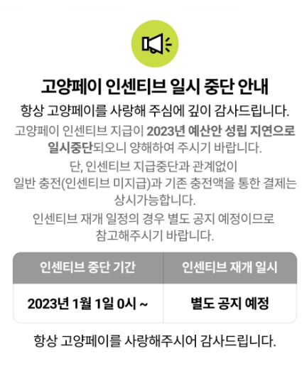고양페이 인센티브 일시중단
