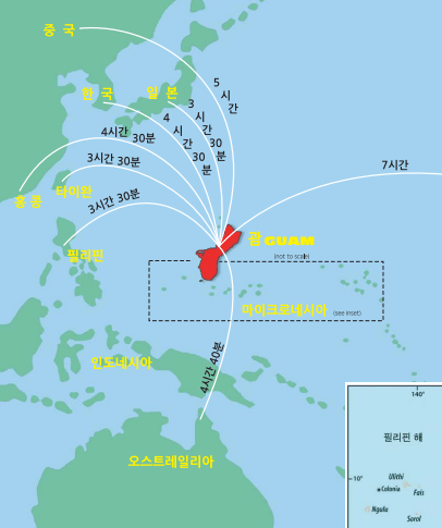 괌은 아래 지도에 표시해두었는데 대한민국에서 3000km 떨어진, 비행시간으로는 4시간 15분 정도 걸리는 태평양 한가운데 있습니다. 하트 표시는 오키나와이고 한국에서 오키나와까지 거리의 2배 정도를 더 들어가면 도착합니다.