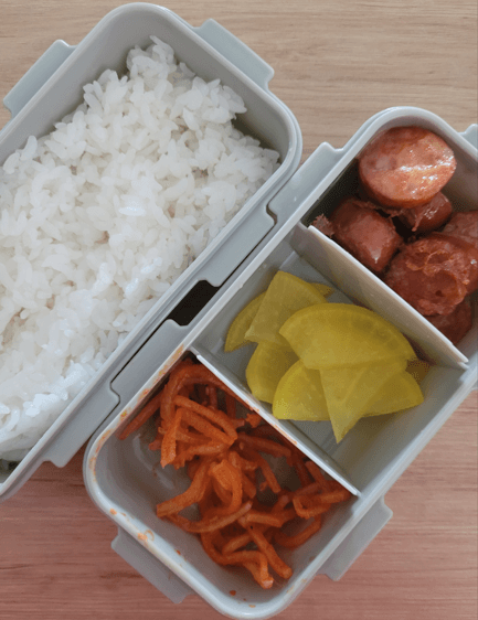 진미채, 단무지, 햄 아침에 싸줄 수 있는 최선을 다해 싼 도시락이었어요. 반찬가게도 있으니 걱정 마세요. 없는 반찬 없이 다 팔아요. 그리고 생각보다 한국반찬과 식자재가 다른 상품에 비해 그리 비싼 느낌이 아니었어요.