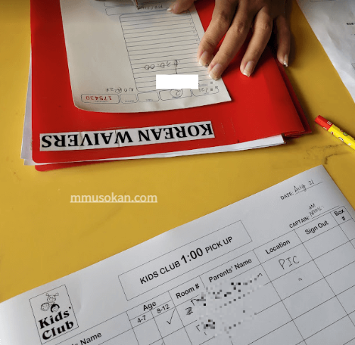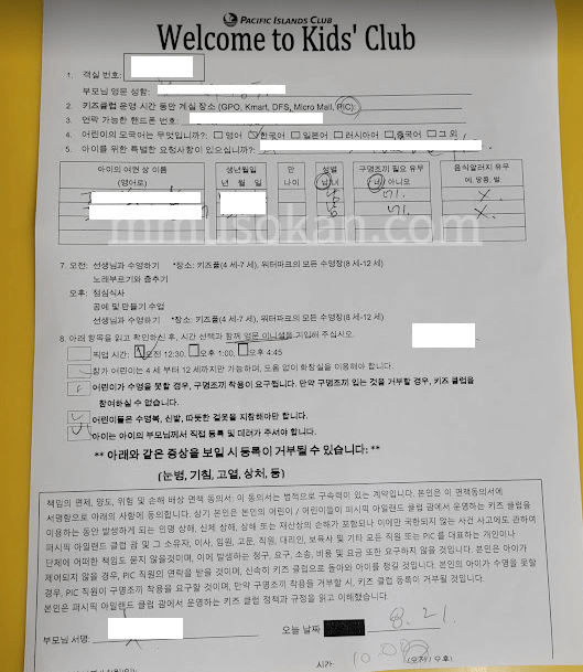 등록 시 줄을 서서 키즈클럽 안으로 들어가면 순서대로 아래와 같은 키즈클럽신청서를 작성하게 됩니다.