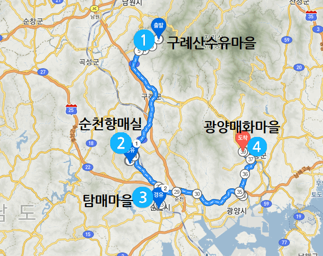 구례산수유마을에서부터 순천향매실마을, 탐매마을, 광양매화마을도 많이들 가시더라고요. 구례산수유마을에서부터 광양매화마을까지는 52km 정도로 자동차로 1시간 정도 소요되는 것으로 나오는데 체력이 되신다면 한 번에 보시는 것도 추천드려요.