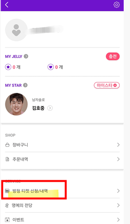 3.중간 아랫 부분 방청 티켓 신청/내역 을 확인해주세요