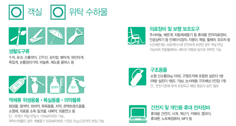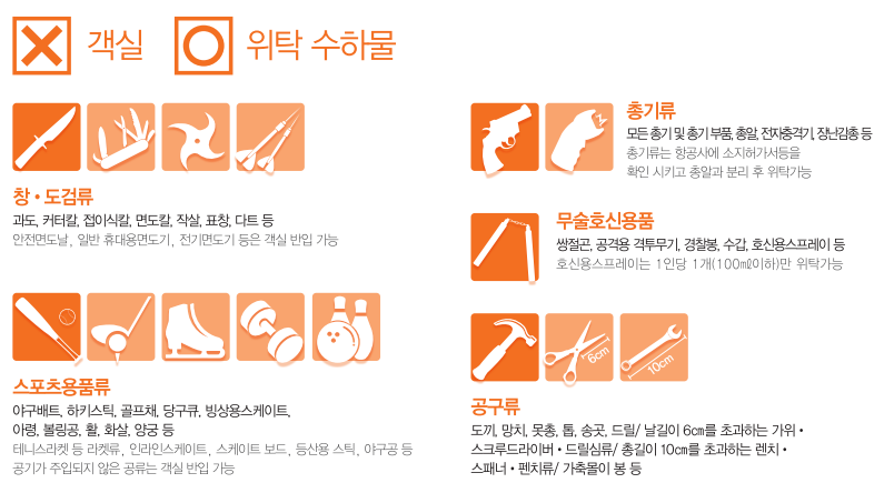 기타 위험 물질 - 소화기, 에어로졸(살충제 등), 락스, 파마약 등 탑승객 및 항공기에 위험이 될 가능성이 있는 물질