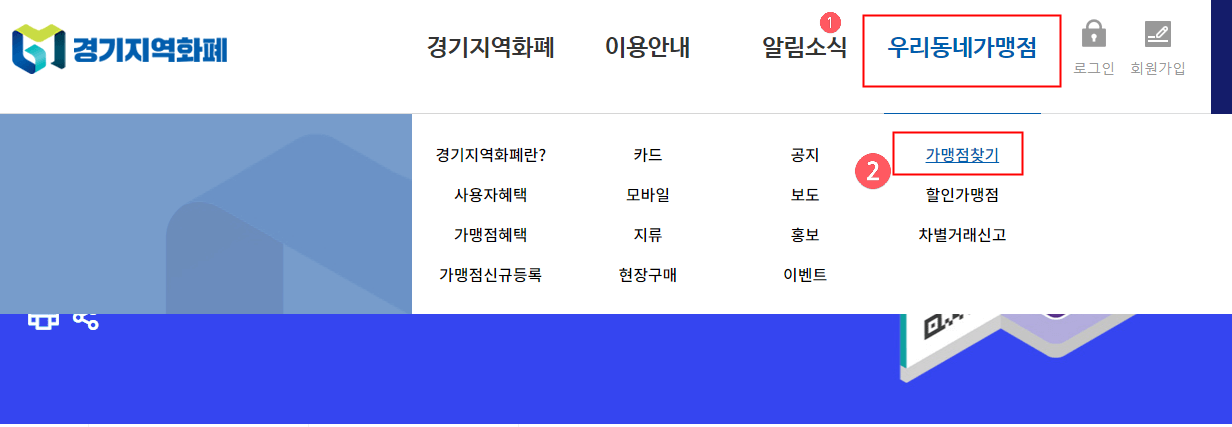 모바일에서는 메인화면 하단 부분에 가맹점 찾기 배너를 확인하여 검색해 주시면 됩니다.