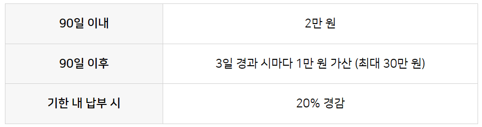 90일 이후에는 3일 경과시마다 1만 원이 가산되며 최대 30만 원입니다. 기한 내 납부 시에는 20% 경감됩니다.
