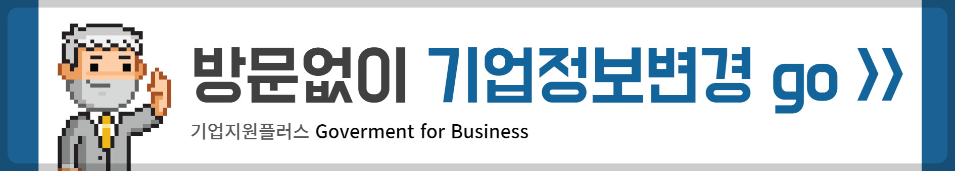 기업정보변경 서비스란? 기업지원 플러스 기업의 사업자 등록내용(상호, 소재지, 업종) 변경 시 방문 처리해야 하는 행정기관 신고를 G4B를 통해 온라인으로 통합 신청·변경할 수 있는 서비스입니다.