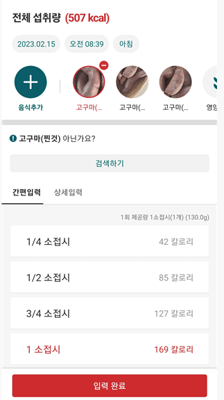 손목닥터로 식사 사진만 찍어도 알아서 자동으로 칼로리가 계산되어서 볼 수 있어요. 이게 효과가 있을까 싶었는데 왠지 고칼로리로 뜨면 신경 쓰게 되더라고요. 1/2 접시 1/4 접시 이런 식으로 내가 선택할 수 도 있어서 좋더라고요. 식단 사진을 연속 2번 찍어도 50포인트를 받을 수 있습니다.