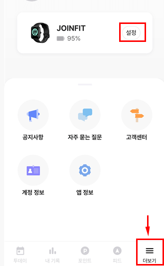 연결방법은 어플에 들어가서 제일 오른쪽 더 보기를 눌러주시고 설정을 들어가서 알람 받길 원하는 항목을 체크해 주시면 됩니다. 그 이후 손목닥터에서는 화면을 위에서 아래로만 내려주셔도 해당 알람 내용을 볼 수 있습니다. 참고로 손목닥터 워치(조인핏)에서는 문자나 카톡의 텍스트는 볼 수 있지만 이미지는 볼 수 없습니다.