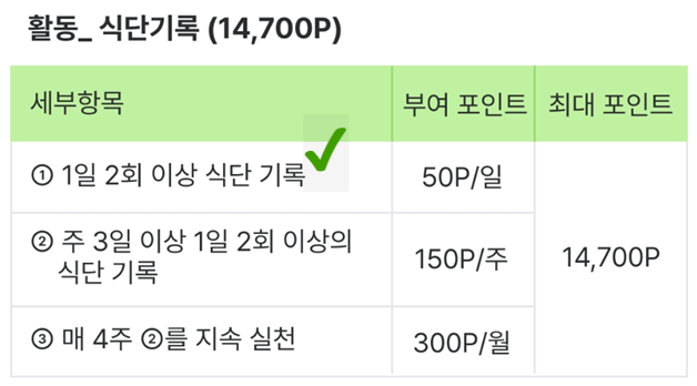 이걸 주 3일 이상 지속하면 1주에 500포인트는 추가로 주고 주 3일 실천하는 것을 4주 실천하면 월에 800포인트는 추가로 받을 수 있답니다.