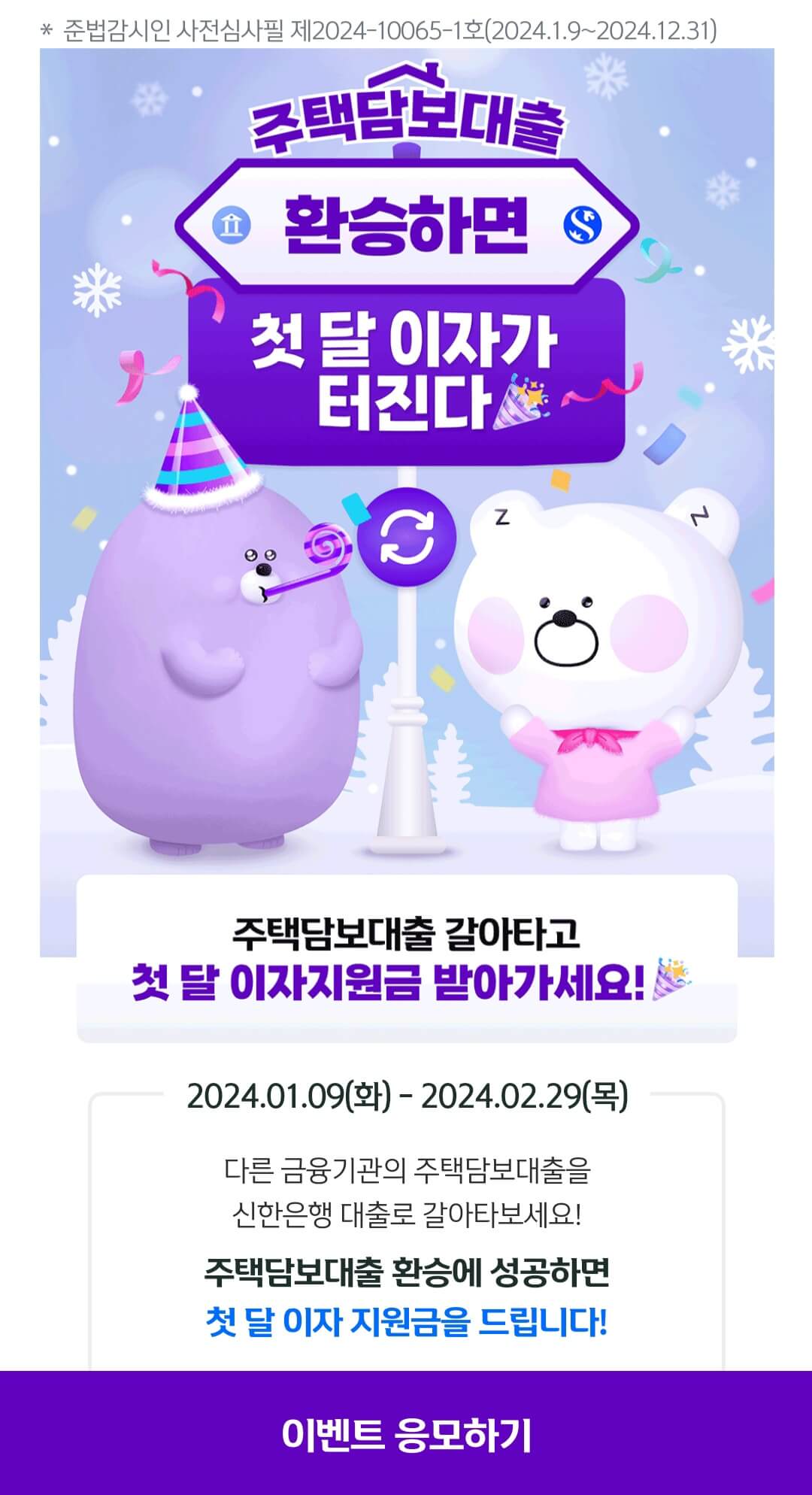 신한은행은 온라인 대환대출 이벤트는 다른금융사에서 신한은행으로 대환대출 즉 대출갈아타기를 하는 분을 대상으로 첫 달 이자 최대 20만원을 지원합니다. 선착순 500명에게 제공되고 마이신한포인트로 지급됩니다.
