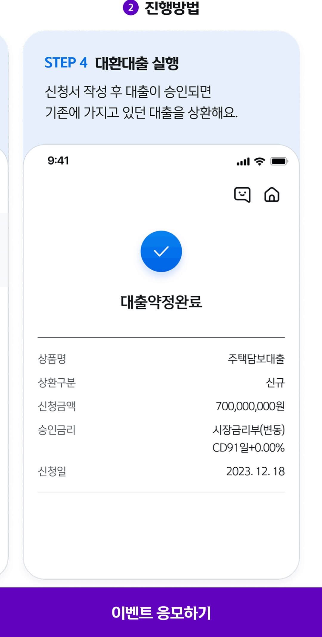 참여방법은 대환대출 실행 전후 관계없이 신한 SOL뱅크 이벤트 페이지에서 '응모하기'를 통해 신청할 수 있습니다.