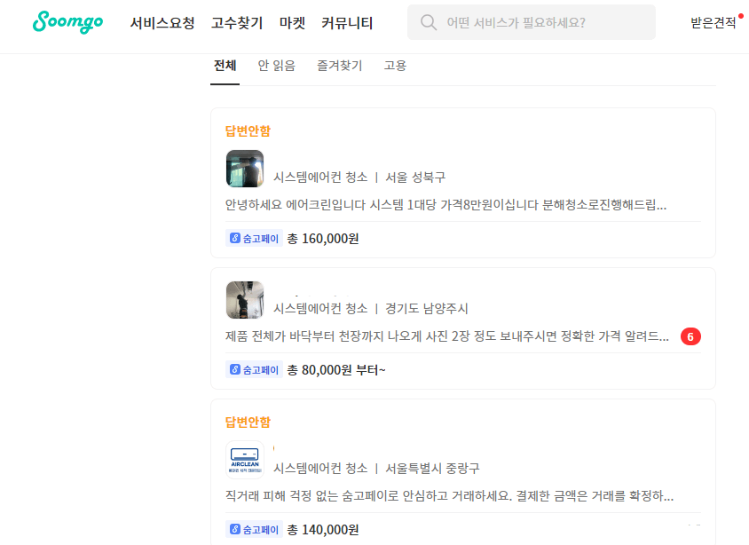 저는 숨고를 통해서 정리수납컨설팅도 받아본적이 있어서 이번에 에어컨청소도 지역과 에어컨형태를 선택해서 신청하니 아래처럼 많은 업체에서 견적을 주셨어요. 보시고 후기도 좋고 만족도도 높은 곳으로 진행하는 것도 추천드려요.