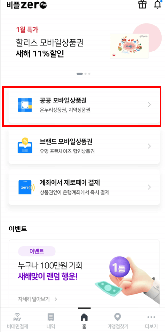 👉 일단 제로페이 어플에 들어가서 보시면 메인에 공공 모바일 상품권이 보입니다.