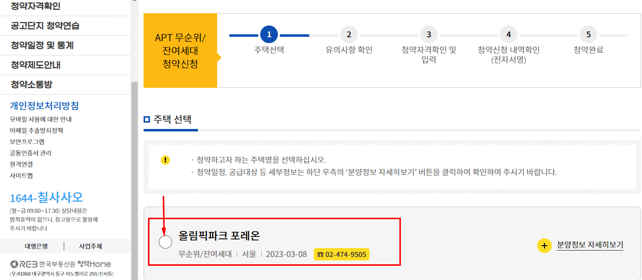 3. 올림픽파크포레온 체크해주시고 원하는 타입을 체크해주시면 신청완료