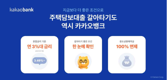 카카오뱅크는 최저 연 3%대의 금리로 주택담보대출 갈아타기 서비스를 제공합니다. 이 서비스는 챗봇을 통해 편리하게 대출 조건을 조회할 수 있으며, 기존 대출 이자, 근저당권 해지비용, 중도상환해약금 등을 사전에 확인할 수 있습니다.