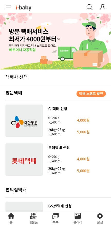 집으로 방문수거가 가능합니다. 아이베이비 어플을 다운로드하면 위와 같은 화면을 볼 수 있어요. 보통 온라인 예약할 때는 착불이 안되고 선불만 되었는데 해당 어플에서는 착불로 선택해서 집으로 방문수거도 가능하니 집 근처에 편의점이 없거나 편의점 나가는 것도 번거로우신 분들에게 추천드립니다.