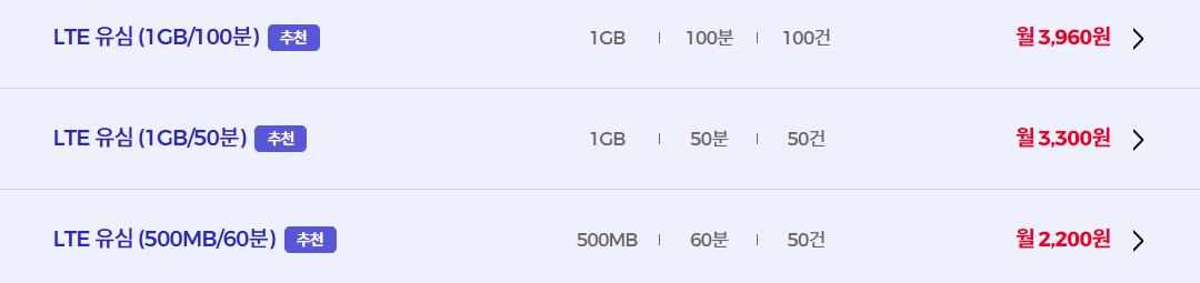 ✔ LTE 유심 1GB / 100분 / 100건 월 3,960원