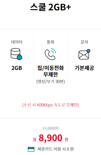 ✔ 스쿨 2GB/ 집, 이동전화 무제한 /기본제공 월 8,900원