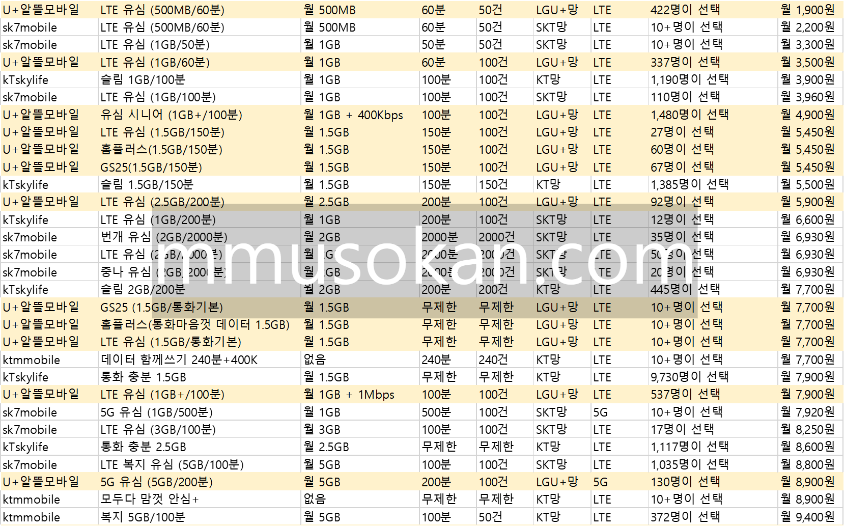 몇 명이 선택했는지도 리스트 정리되어 있어서 인기 많은 요금제를 확인할 수도 있습니다. 해당 파일은 아래 엑셀로도 첨부하였으니 참고하시길 바랍니다. 아래는 그 중 저렴한 요금 상품으로 추려보았습니다.