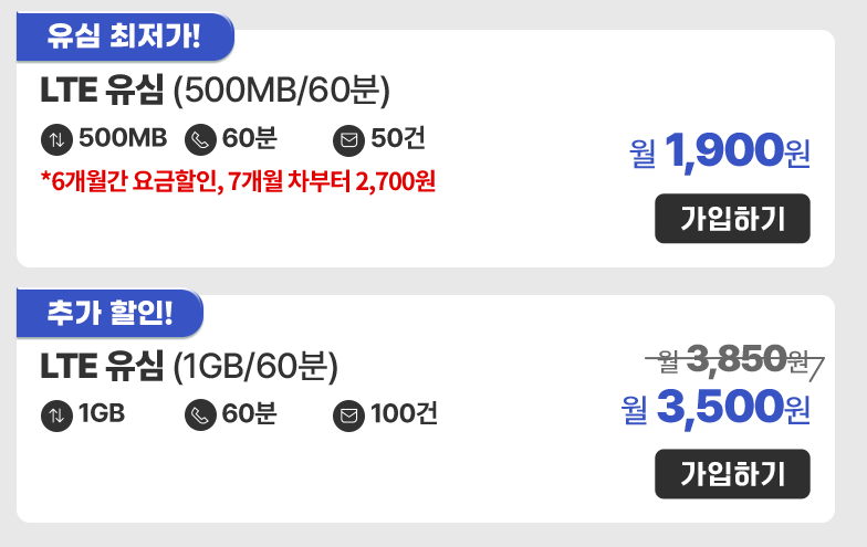 ✔ LTE유심 1GB / 60분 / 100건 월 3,500원