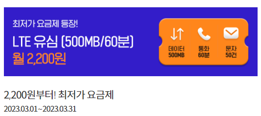 ✔ LTE 유심 500MB / 60분 / 50건 월 2,200원