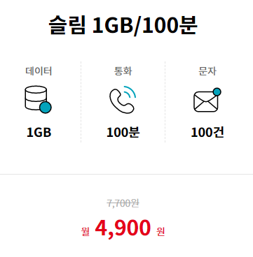 ✔ 슬림 1GB / 100분 /100건 월 4900원