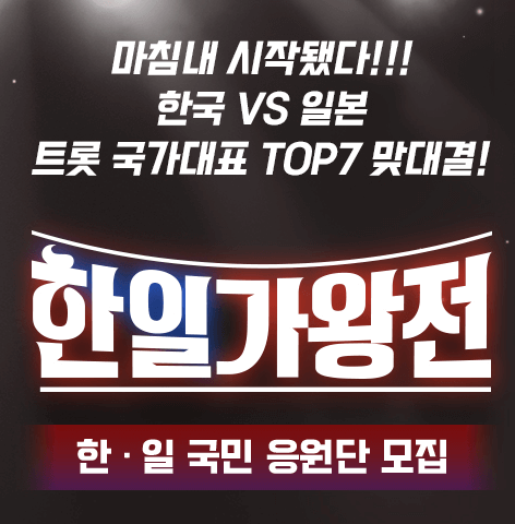 한일가왕전 드디어 시작됩니다. 일본과 한국을 대표하는 각국의 트로트 국가대표 top7의 대결 놓치지 마시고 직접 방청하면서 응원도 하고 투표할 수 있는 기회 놓치지마세요. 한일 국민응원단 모집중입니다. 빠르게 신청해주세요.