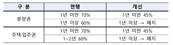 단기 보유 주택 거래에 대한 양도세 부담도 낮춘다. 현행 분양권 및 주택·입주권 양도세율은 1년 미만 보유 시 70%, 1년 이상 보 유시 60% 이상인데, 이를 1년 미만은 45%로 낮추고, 1년 이상은 기본세율(6~45%)을 적용하기로 했다.
