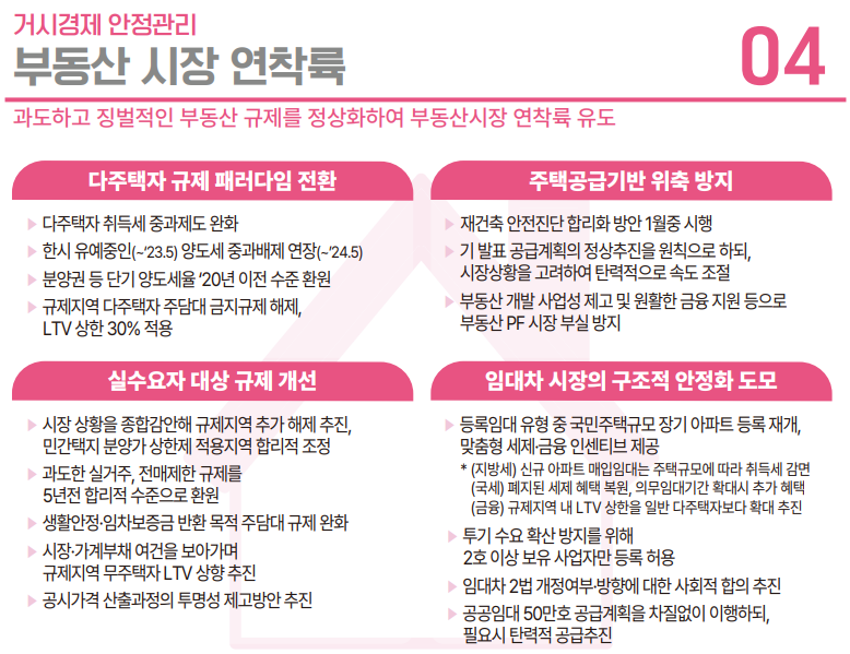 지난 정부에서 보여주었던 프레임은 다주택자 = 적폐 = 공공의 적 으로 간주하여 정책을 펼쳤었는데 이번 2023 경제정책방향 브로셔에서는 과도하고 징벌적인 부동산 규제라고 써있어서 조금은 놀랐네요.