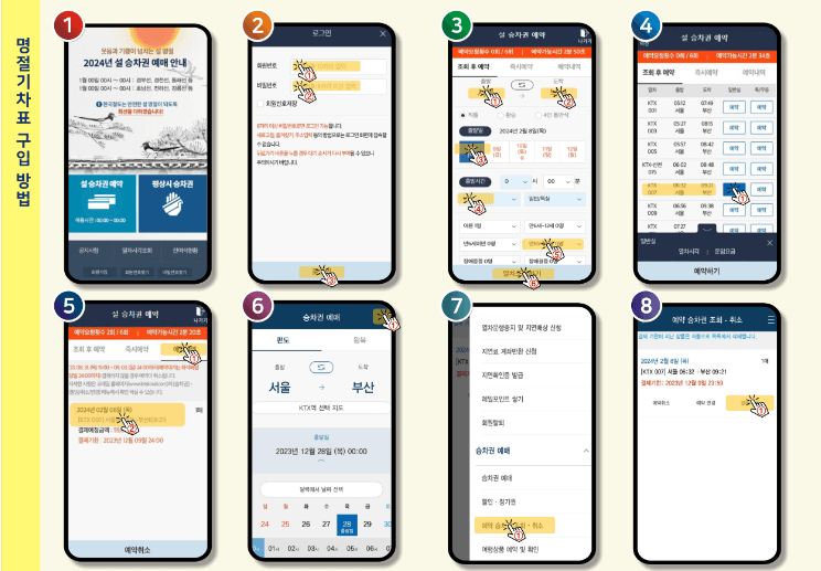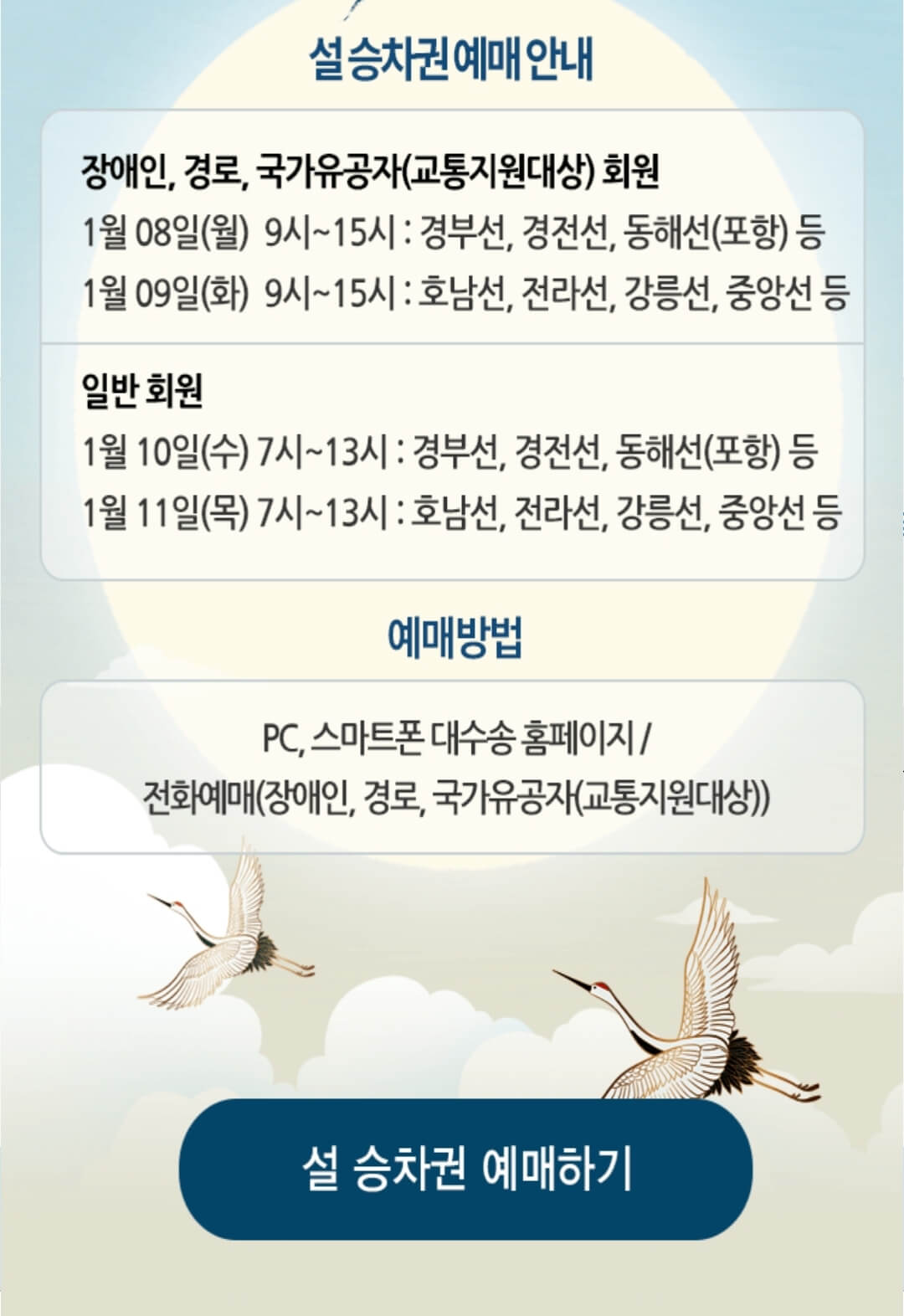 이번 설연휴는 2025년 1월 28일(화요일)부터 1월 30일(목요일)까지 총 3일로 기간도 짧아서 경쟁률이 더 치열할 것으로 보입니다. 교통약자 (경로, 장애인) 먼저 진행되고 그다음 전 국민 예매가 가능합니다.