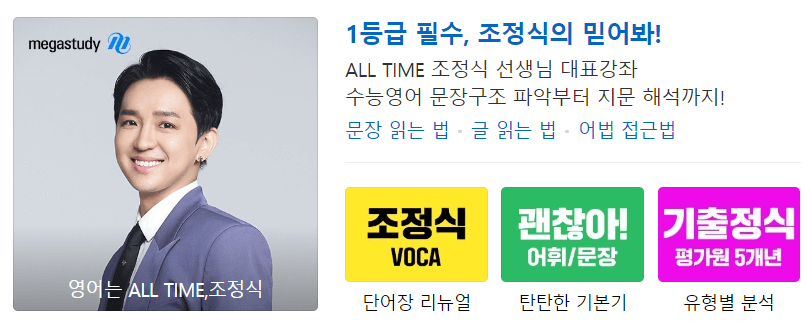다수의 수다 프로그램에 대한민국 영어 일타강사로도 얼마 전 유퀴즈에도 출연하셨습니다. 정말 일타강사는 연예인 그 이상으로 바쁘고 치열하게 수업준비하며 살고 계시더라고요. 메가스터디에서 인강을 들을 수 있습니다. 방송에서 1위 강사 아는 법은 강사 사진과 이름이 앞으로 나오면 쉽게 알 수 있다는 팁도 나왔습니다.
